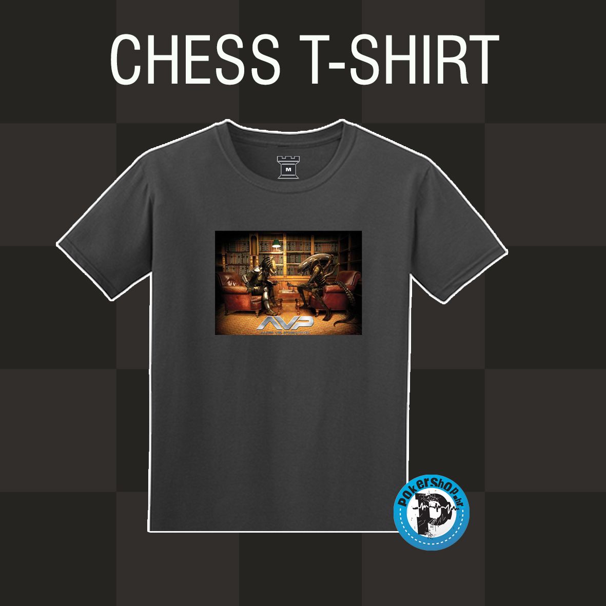 T-shirt s motivom iz filma Alien vs. Predator prikazuje legendarni prizor gdje dva vanzemaljska lika igraju šah. Ova majica je idealan poklon za igrače šaha, ali i za sve one koji vole filmove, posebno znanstvenu fantastiku.